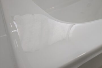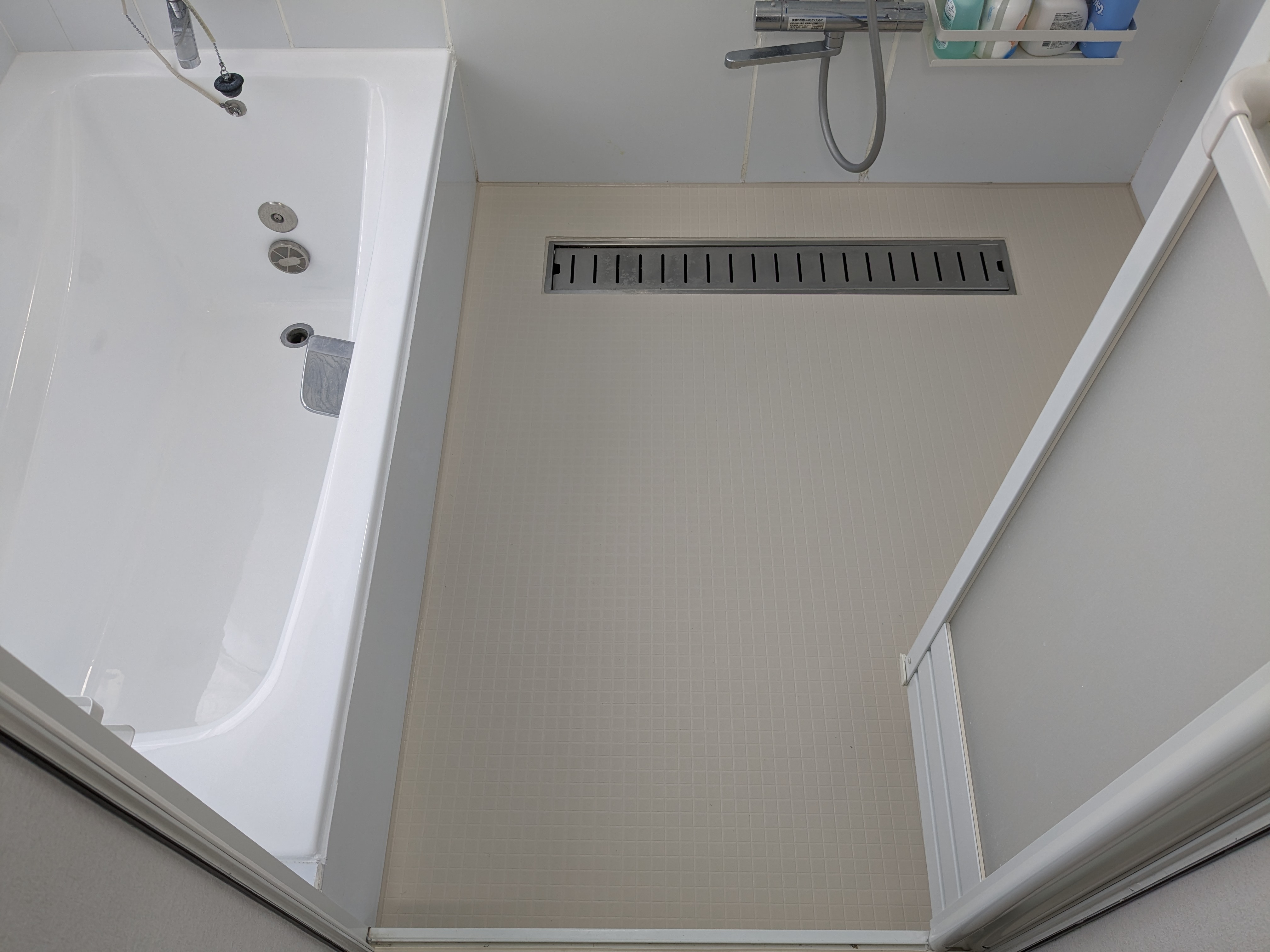浴槽を塗装してみたが、うまくいかなかった。また、床のシートも剥がれかかっていたので見てみると下地処理をしないで貼っていた。