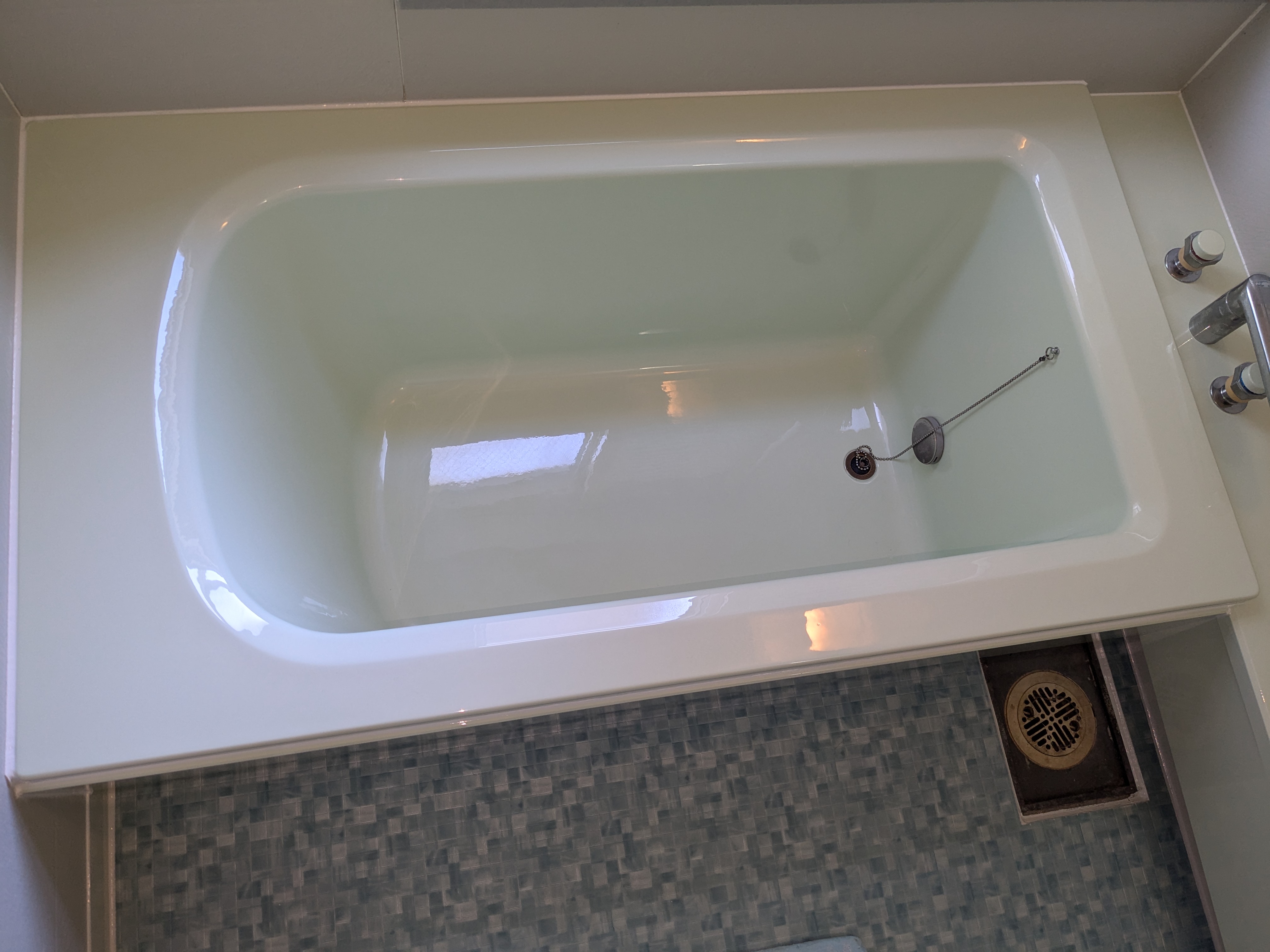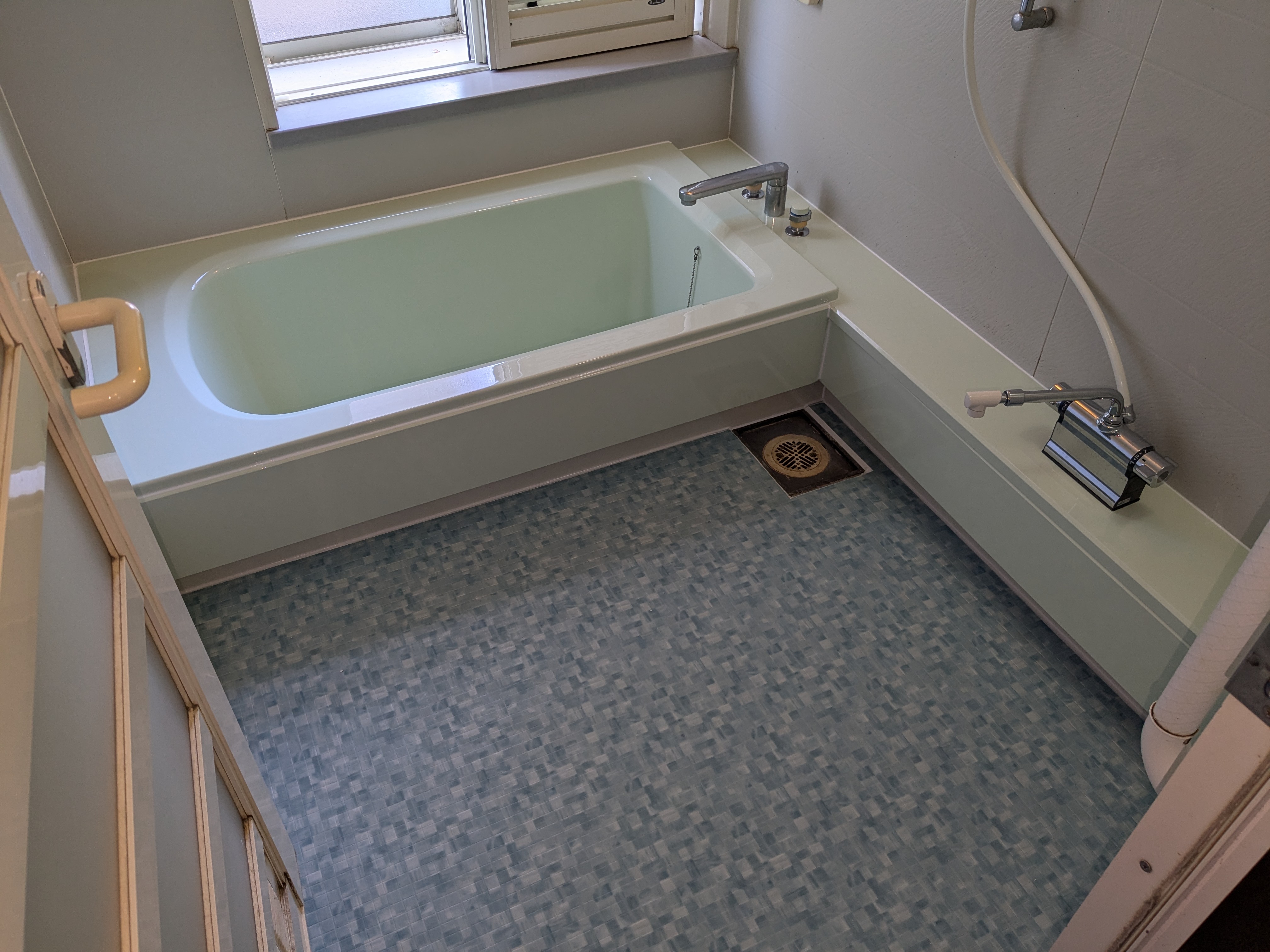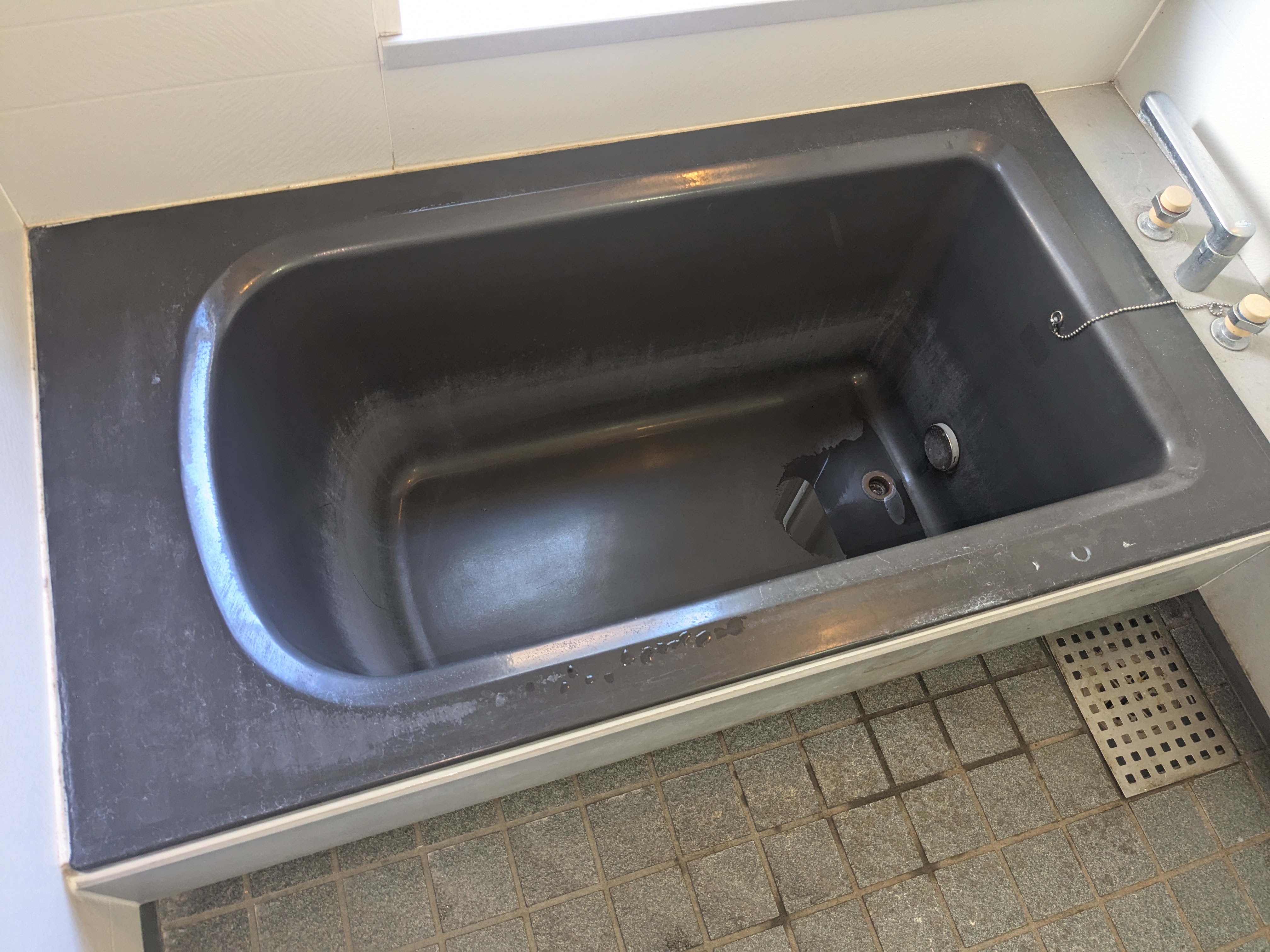 メールでの直接問い合わせがあり、まず写真を送っていただきました。使用後、排水をせずに翌朝までお湯を貯める習慣の結果浴槽内に跡がつくようになった様でした。傷も入って掃除等ではどうにもならないので、樹脂塗装による浴槽再生をしました。また、タイル床も水垢汚れがひどくバスナシート施工をしました。色は奥様の希望で浴槽はパステルグリーン、床はブルーで施工させて頂きました。